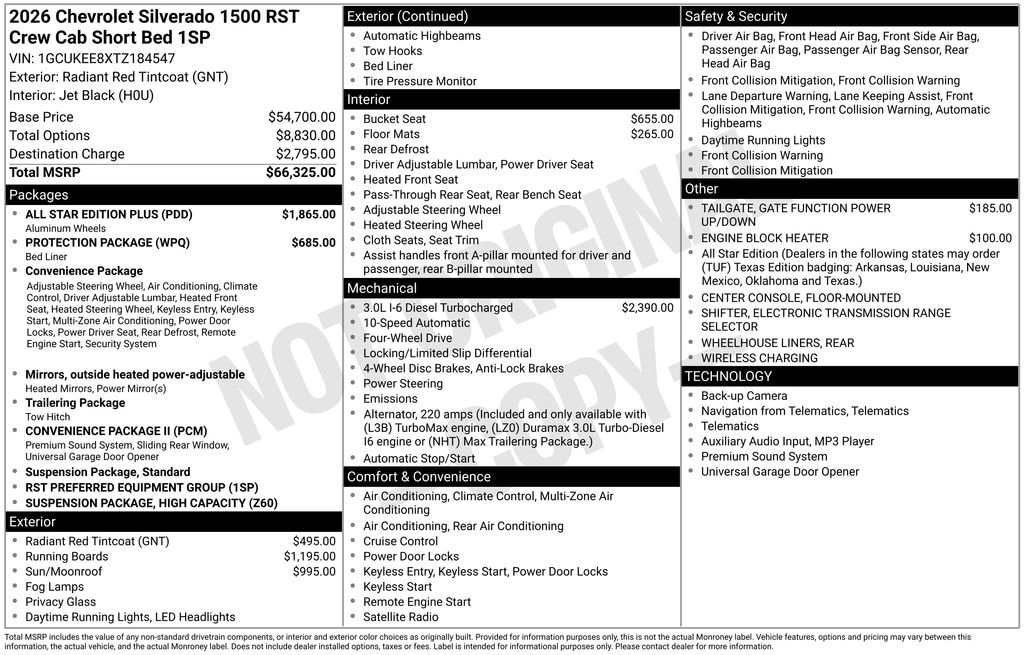 Dealer Discount of $4,893 off MSRP Radiant Red Tintcoat 2026 Chevrolet Silverado 1500 RST fctp 4WD 10-Speed Automatic 3.0L I6 10-Speed Automatic, 4WD, Black Cloth, 10-Way Power Driver Seat with Lumbar, 12.3 Multicolor Reconfigurable Digital Display, 120-Volt Bed Mounted Power Outlet, 120-Volt Interior Power Outlet, 2 USB Data Ports, 220 Amp Alternator, 3.23 Rear Axle Ratio, 4-Wheel Disc Brakes, 40/20/40 Front Split-Bench Seat, 6 Speakers, 6-Speaker Audio System, ABS brakes, Air Conditioning, All Star Edition Plus, All-Star Edition, Alloy wheels, AM/FM radio: SiriusXM with 360L, Apple CarPlay/Android Auto, Auto High-beam Headlights, Auto-Locking Rear Differential, Automatic Emergency Braking, Automatic temperature control, Bluetooth® For Phone, Brake assist, Bumpers: body-color, Chevytec Spray-on Black Bedliner, Cloth Seat Trim, Color-Keyed Carpeting Floor Covering, Compass, Convenience Package, Convenience Package II, Deep-Tinted Glass, Delay-off headlights, Driver door bin, Driver vanity mirror, Dual front impact airbags, Dual front side impact airbags, Dual Rear USB Ports (charge Only), Dual-Zone Automatic Climate Control, Electric Rear-Window Defogger, Electronic Cruise Control, Electronic Stability Control, Electronic Transmission Range Selector Shifter, Emergency communication system: OnStar, Engine Block Heater, EZ Lift Power Lock and Release Tailgate, Floor Mounted Center Console, Following Distance Indicator, Forward Collision Alert, Front anti-roll bar, Front Bucket Seats, Front Center Armrest w/Storage, Front dual zone A/C, Front fog lights, Front Frame-Mounted Black Recovery Hooks, Front LED Fog Lamps, Front Pedestrian Braking, Front reading lights, Front Rubberized Vinyl Floor Mats, Front wheel independent suspension, Fully automatic headlights, HD Rear Vision Camera, Heated door mirrors, Heated Driver and Front Outboard Passenger Seats, Heated front seats, Heated Power-Adjustable Outside Mirrors, Heated Steering Wheel, Heated steering wheel, High Capacity Suspension Package, High Gloss Black Mirror Caps, Hitch Guidance, Hitch Guidance with Hitch View, Illuminated entry, in-Vehicle Trailering System App, Inside Rearview Mirror with Tilt, Integrated Trailer Brake Controller, IntelliBeam Automatic High Beam on/Off, Keyless Open and Start, Lane Keep Assist with Lane Departure Warning, LED Cargo Area Lighting, Low tire pressure warning, Manual Tilt/Telescoping Steering Column, Occupant sensing airbag, Off-Road High Clearance Steps, OnStar Services Capable, Outside temperature display, Overhead airbag, Overhead console, Panic alarm, Passenger door bin, Passenger vanity mirror, Power door mirrors, Power driver seat, Power Front Windows with Driver Express Up/Down, Power Front Windows with Passenger Express Down, Power Rear Windows with Express Down, Power Sliding Rear Window with Rear Defogger, Power steering, Power Sunroof, Power Tailgate, Power windows, Preferred Equipment Group 1SP, Premium audio system: Chevrolet Infotainment 3 Premium, Premium Bose 7-Speaker Sound System, Protection Package, Radio data system, Radio: Chevrolet Infotainment 3 Premium System, Rear 60/40 Folding Bench Seat (folds Up), Rear reading lights, Rear Rubberized-Vinyl Floor Mats, Rear step bumper, Rear Wheelhouse Liners, Rear window defroster, Remote keyless entry, Remote Vehicle Starter System, Security system, Single Outlet Exhaust, SiriusXM with 360L Trial Subscription, Speed control, Speed-sensing steering, Split folding rear seat, Standard Suspension Package, Standard Tailgate, Steering Wheel Audio Controls, Steering wheel mounted audio controls, Tachometer, Teen Driver, Telescoping steering wheel, Theft Deterrent System (unauthorized Entry), Tilt steering wheel, Tire Pressure Monitoring System, Traction control, Trailering Package, Trip computer, Universal Home Remote, Variably intermittent wipers, Voltmeter, Wheels: Price includes: $1250 - Chevrolet Consumer Cash Program. Exp. 04/30/2026