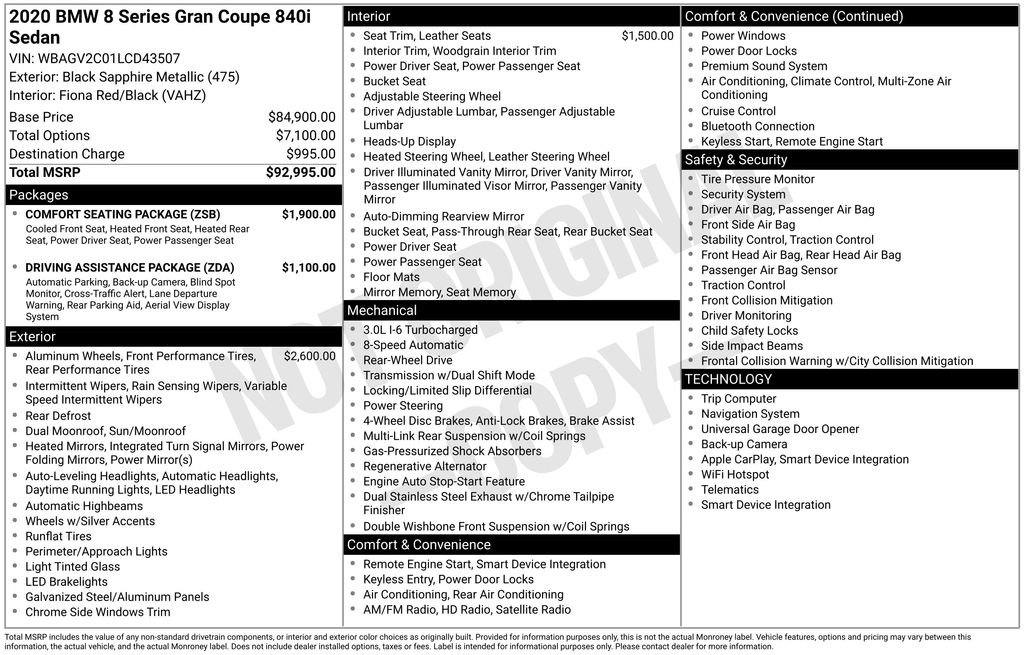 2020 BMW 8 Series 840 Black Sapphire Metallic 840 RWD 8-Speed Automatic Sport 3.0L I6 DOHC 24V TwinPower Turbo 16 Speakers, 4-Wheel Disc Brakes, ABS brakes, Active Blind Spot Detection, Active Driving Assistant, Active Park Distance Control, Air Conditioning, Alloy wheels, AM/FM radio: SiriusXM, Apple CarPlay Compatibility, Auto High-beam Headlights, Auto tilt-away steering wheel, Auto-dimming door mirrors, Auto-dimming Rear-View mirror, Automatic temperature control, Brake assist, Bumpers: body-color, Comfort Seating Package, Delay-off headlights, Door auto-latch, Drive Recorder, Driver door bin, Driver vanity mirror, Driving Assistance Package, Dual front impact airbags, Dual front side impact airbags, Electronic Stability Control, Emergency communication system: BMW Assist eCall, Exterior Parking Camera Rear, Four wheel independent suspension, Front & Rear Heated Seats, Front anti-roll bar, Front Bucket Seats, Front Center Armrest, Front dual zone A/C, Front reading lights, Front Ventilated Seats, Fully automatic headlights, Garage door transmitter, Genuine wood console insert, harman/kardon Surround Sound System, harman/kardon® Speakers, Heads-Up Display, Heated door mirrors, Heated front seats, Heated steering wheel, Illuminated entry, Lane Departure Warning System, Leather Shift Knob, Leather steering wheel, Low tire pressure warning, Lumbar Support, Memory seat, Multi-Functional Seats, Navigation System, Occupant sensing airbag, Outside temperature display, Overhead airbag, Panic alarm, Parking Assistant Plus, Passenger door bin, Passenger vanity mirror, Power door mirrors, Power driver seat, Power moonroof, Power passenger seat, Power Rear Sunshade & Rear Side Window Shades, Power steering, Power windows, Radio data system, Radio: AM/FM Audio System, Rain sensing wipers, Rear air conditioning, Rear anti-roll bar, Rear dual zone A/C, Rear Window Blind, Rear window defroster, Rear-View Camera, Remote keyless entry, Security system, SiriusXM Satellite Radio, Speed control, Speed-sensing steering, Speed-Sensitive Wipers, Split folding rear seat, Sport Seats, Steering wheel memory, Steering wheel mounted audio controls, Surround View w/3D View, Tachometer, Telescoping steering wheel, Tilt steering wheel, Traction control, Trip computer, Turn signal indicator mirrors, Variably intermittent wipers, Vernasca Leather Upholstery, Wheels: 18 x 8 Fr & 18 x 9 Rr V-Spoke, Wheels: 20 x 8 Fr & 20 x 9 Rr V-Spoke, WiFi Hotspot, Wireless Charging.