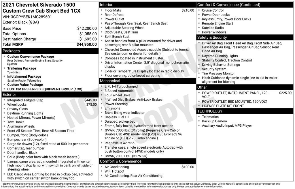 2021 Chevrolet Silverado 1500 Custom Black Custom 4WD 8-Speed Automatic 2.7L Turbo 8-Speed Automatic, 4WD, Black Cloth, 120-Volt Bed Mounted Power Outlet, 120-Volt Instrument Panel Power Outlet, 170 Amp Alternator, 3.42 Rear Axle Ratio, 3.5 Diagonal Monochromatic Display, 4-Wheel Disc Brakes, 40/20/40 Front Split Bench Seat, 4G LTE Wi-Fi Hot Spot Capable, 6 Speakers, ABS brakes, Air Conditioning, All-Weather Floor Liner (LPO), Alloy wheels, AM/FM radio: SiriusXM, Apple CarPlay/Android Auto, Bluetooth® For Phone, Body Color Grille, Brake assist, Bumpers: body-color, Chevrolet Connected Access Capable, Cloth Seat Trim, Color-Keyed Carpeting Floor Covering, Compass, Custom Convenience Package, Custom Value Package, Deep-Tinted Glass, Delay-off headlights, Driver door bin, Driver vanity mirror, Dual front impact airbags, Dual front side impact airbags, Electric Rear-Window Defogger, Electronic Cruise Control, Electronic Stability Control, EZ Lift Power Lock & Release Tailgate, Front anti-roll bar, Front Center Armrest w/Storage, Front Frame-Mounted Black Recovery Hooks, Front License Plate Kit, Front reading lights, Front Rubberized Vinyl Floor Mats, Front wheel independent suspension, Fully automatic headlights, Heated door mirrors, Heavy Duty Suspension, Hitch Guidance, Illuminated entry, Infotainment Package, LED Cargo Area Lighting, Low tire pressure warning, Manual Tilt Wheel Steering Column, Multi-Flex Tailgate, Occupant sensing airbag, OnStar & Chevrolet Connected Services Capable, Outside temperature display, Overhead airbag, Overhead console, Panic alarm, Passenger door bin, Passenger vanity mirror, Polished Exhaust Tip, Power Door Locks, Power door mirrors, Power Front Windows w/Driver Express Up/Down, Power Front Windows w/Passenger Express Down, Power Rear Windows w/Express Down, Power steering, Power windows, Preferred Equipment Group 1CX, Premium audio system: Chevrolet Infotainment 3, Radio data system, Radio: Chevrolet Infotainment 3 System, Rear 60/40 Folding Bench Seat (Folds Up), Rear reading lights, Rear Rubberized-Vinyl Floor Mats, Rear step bumper, Rear window defroster, Remote Keyless Entry, Remote keyless entry, Remote Vehicle Starter System, Security system, Single-Zone Manual/Semi-Automatic Air Conditioning, SiriusXM Radio, Speed control, Speed-sensing steering, Split folding rear seat, Standard Tailgate, Tachometer, Theft Deterrent System (Unauthorized Entry), Tilt steering wheel, Traction control, Trailering Package, Trip computer, Variably intermittent wipers, Voltmeter, Wheel Locks (Set of 4) (LPO), Wheels: 20 x 9 Bright Silver Painted Aluminum, 8-Speed Automatic, 4WD, Black Cloth.Recent Arrival! Odometer is 10376 miles below market average!