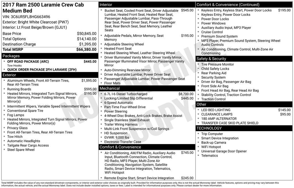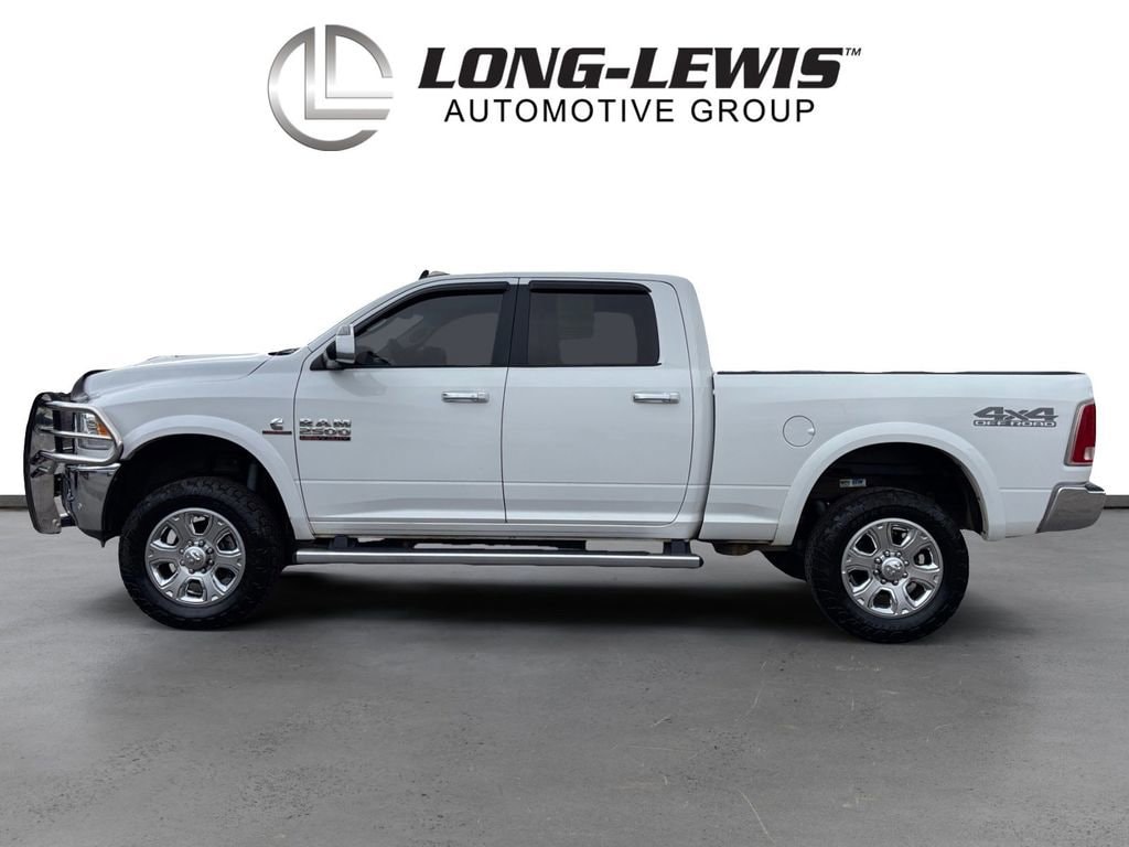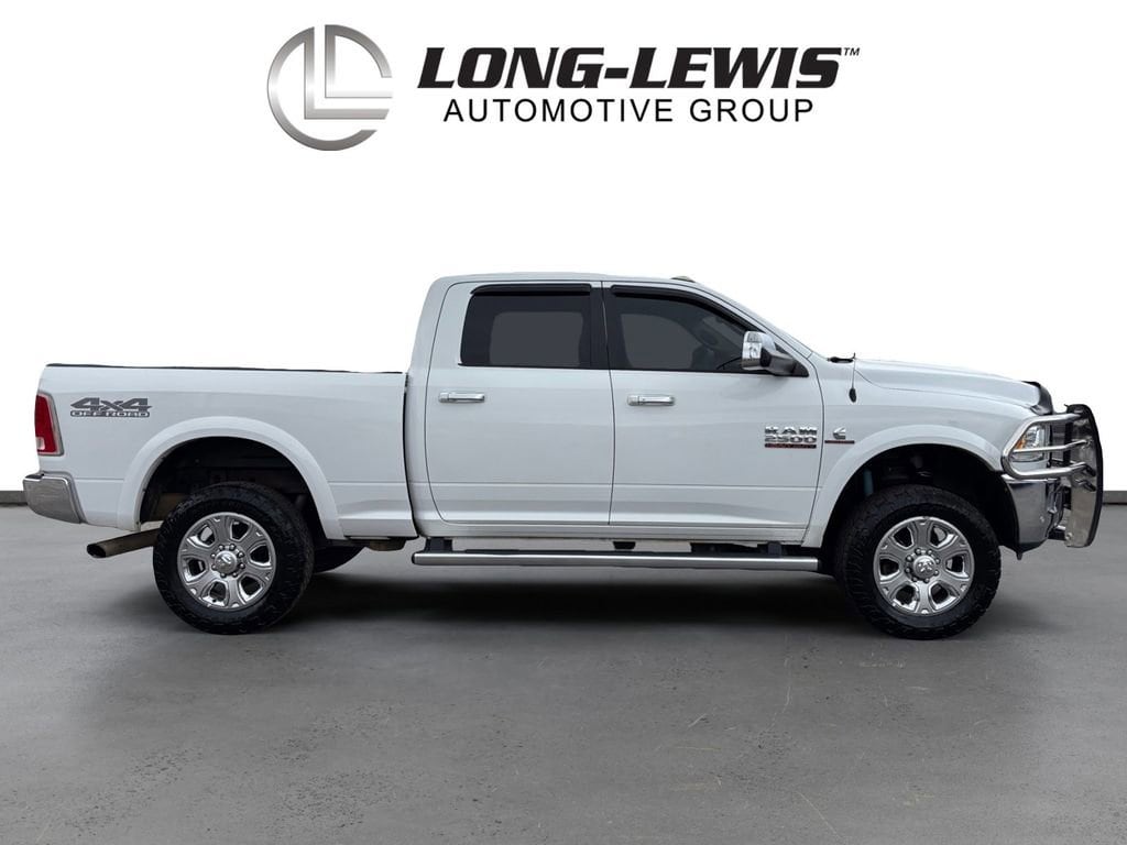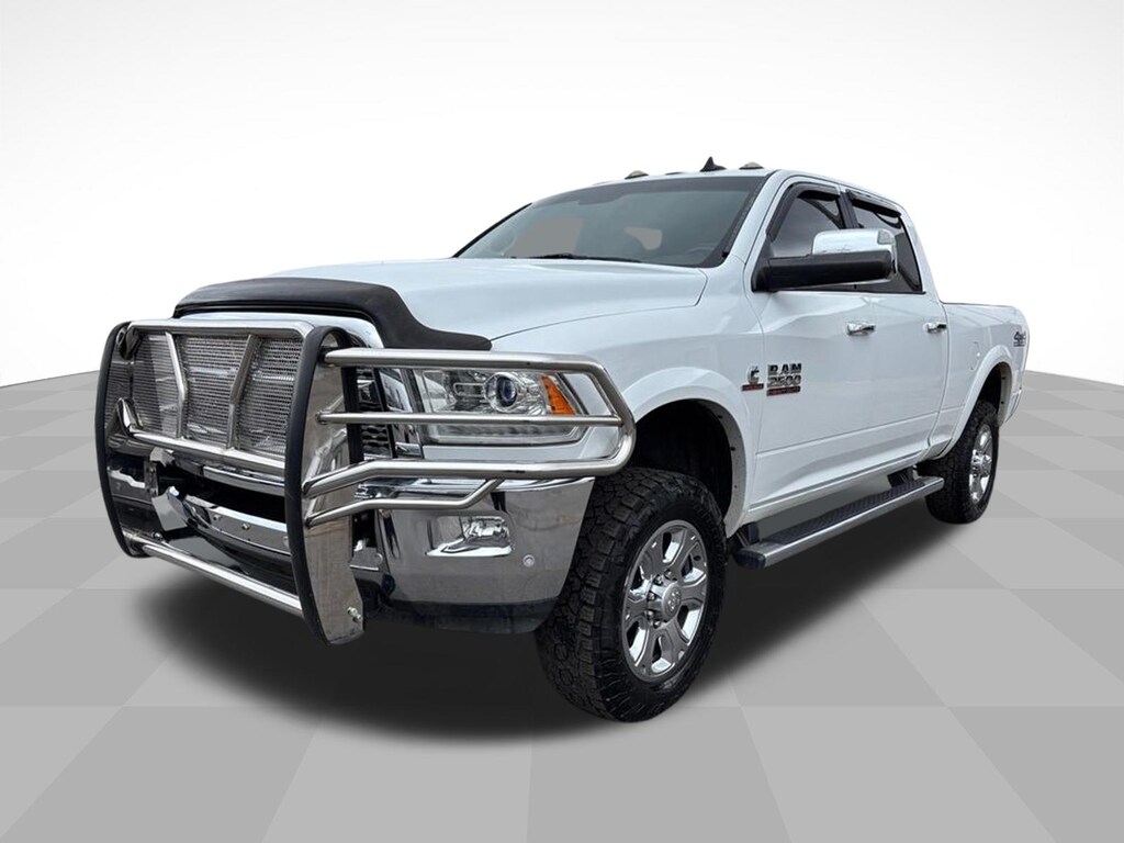 2017 Ram 2500 Laramie Bright White Clearcoat Laramie 4WD 6-Speed Automatic Cummins 6.7L I6 Turbodiesel 1 Year Trial (Registration Required), 10 Speakers, 115V Auxiliary Power Outlet, 180 Amp Alternator, 4-Wheel Disc Brakes, 5-Year SiriusXM Traffic Service, 5-Year SiriusXM Travel Link Service, 8.4 Touchscreen Display, ABS brakes, Air Conditioning, Air Conditioning ATC w/Dual Zone Control, Alloy wheels, AM/FM radio: SiriusXM, Anti-Spin Differential Rear Axle, Audio memory, Auto-dimming door mirrors, Auto-dimming Rear-View mirror, Automatic temperature control, Brake assist, Bumpers: chrome, Center Hub, Chrome Exterior Mirrors, Chrome Tubular Side Steps, Clearance Lamps, Compass, Delay-off headlights, Driver door bin, Driver vanity mirror, Dual front impact airbags, Dual front side impact airbags, Electronic Stability Control, Emergency communication system: Uconnect Access, Exterior Mirrors Courtesy Lamps, Exterior Mirrors w/Heating Element, Exterior Mirrors w/Memory, Exterior Mirrors w/Supplemental Signals, For Details Visit DriveUconnect.com, Front anti-roll bar, Front Armrest w/Cupholders, Front Center Armrest w/Storage, Front dual zone A/C, Front fog lights, Front Performance Tuned Shock Absorbers, Front reading lights, Fully automatic headlights, Garage door transmitter, GPS Antenna Input, GPS Navigation, HD Radio, Heated door mirrors, Heated Front Seats, Heated front seats, Heated steering wheel, Illuminated entry, Integrated Voice Command w/Bluetooth, Keyless Enter-N-Go, Leather steering wheel, Leather Trim 40/20/40 Bench Seat, LED Bed Lighting, Low tire pressure warning, Media Hub (2 USB, AUX), Media Hub (USB, AUX), Memory seat, Occupant sensing airbag, Off Road Package, Offroad Decal, Outside temperature display, Overhead airbag, Overhead console, Panic alarm, ParkView Rear Back-Up Camera, Passenger door bin, Passenger vanity mirror, Power Adjustable Pedals w/Memory, Power door mirrors, Power driver seat, Power Folding Chrome Trailer Tow Mirrors, Power Folding Mirrors, Power passenger seat, Power steering, Power windows, Quick Order Package 2FH Laramie, Radio data system, Radio: Uconnect 3C Nav w/8.4 Display, Radio: Uconnect 3C w/8.4 Display, Radio/Driver Seat/Mirrors/Pedals Memory, Rear Performance Tuned Shock Absorbers, Rear seat center armrest, Rear step bumper, Remote keyless entry, Remote Proximity Keyless Entry, Remote Start System, Security system, SiriusXM Satellite Radio, SiriusXM Traffic, SiriusXM Travel Link, Speed control, Split folding rear seat, Steering wheel mounted audio controls, Tachometer, Tilt steering wheel, Tow Hooks, Traction control, Trailer Tow Mirrors, Trip computer, Turn signal indicator mirrors, Uconnect Access, Variably intermittent wipers, Vendor Painted Cargo Box Tracking, Ventilated front seats, Voltmeter, Wheels: 18 x 8.0 Polished Aluminum, Wheels: 20 x 8.0 Painted Aluminum w/Chrome Inserts.